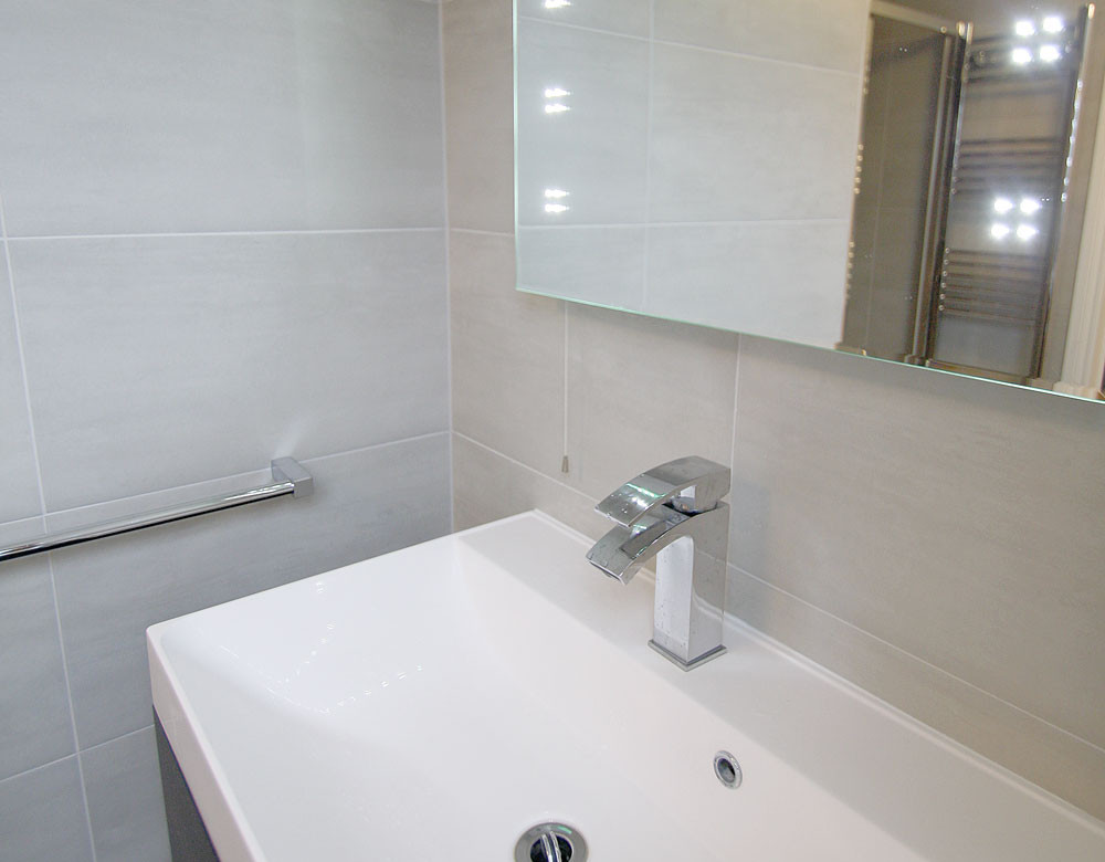 The landing of this top floor bedroom was converted into a master en suite shower room. The modern monochrome design used large nero and grigio Italian tiles on the floor and walls. The shower area was made a feature with an exposed chrome shower valve, black split-face slate feature wall and a sleek illuminated recess. The room was completed with a high quality vanity unit & basin, an illuminated touch free mirror with shaver socket & de-mister pad and a stylish low projection toilet.